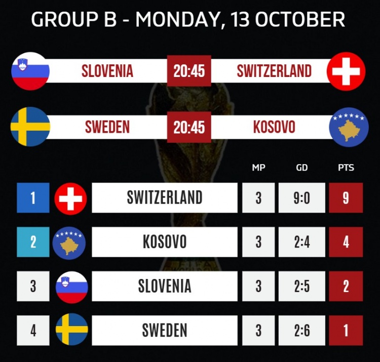 瑞士有望下周二晉級世界杯,只要戰(zhàn)勝斯洛文尼亞且科索沃不勝瑞典